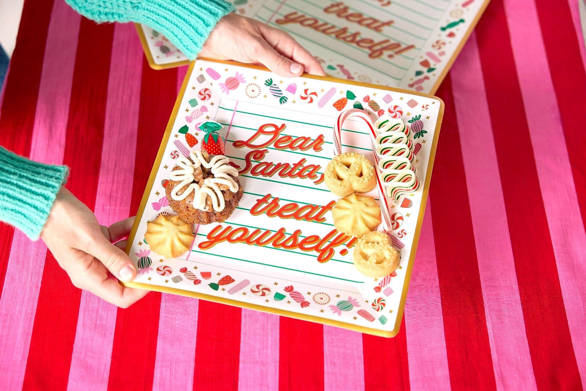 Cookies for Santa never looked this cute! Our Santa Treat Dessert Plates feature a cheeky “Dear Santa, treat yourself” handwritten note design in festive pinks, reds, and mints with shimmering gold foil details. Perfect for desserts, snacks, or Santa’s midnight spread.