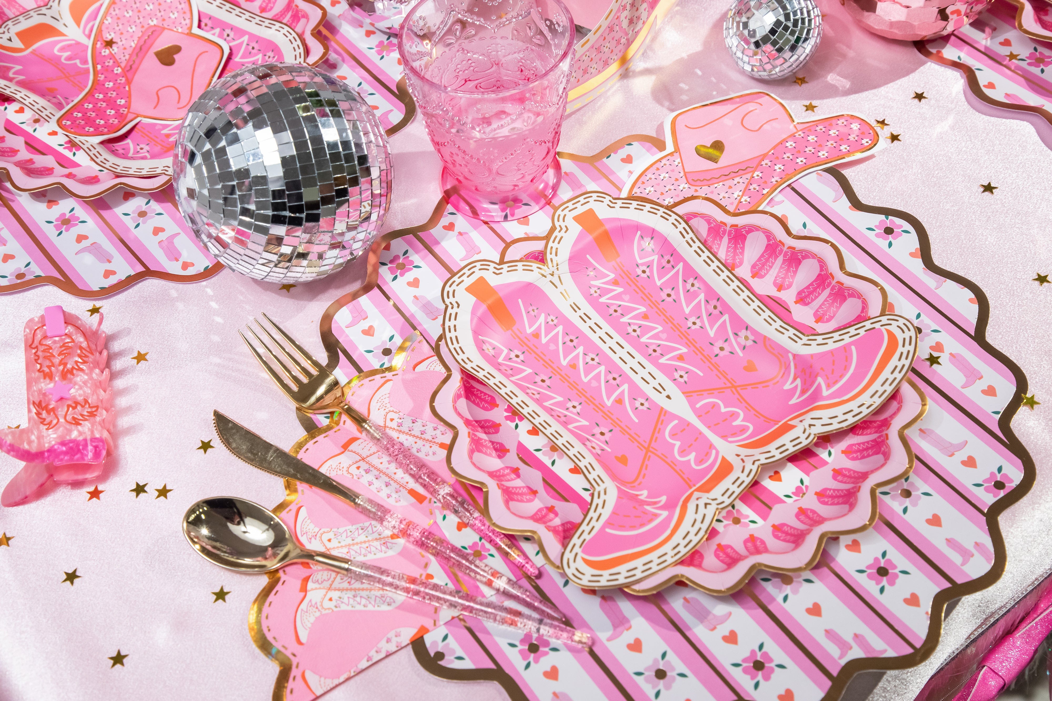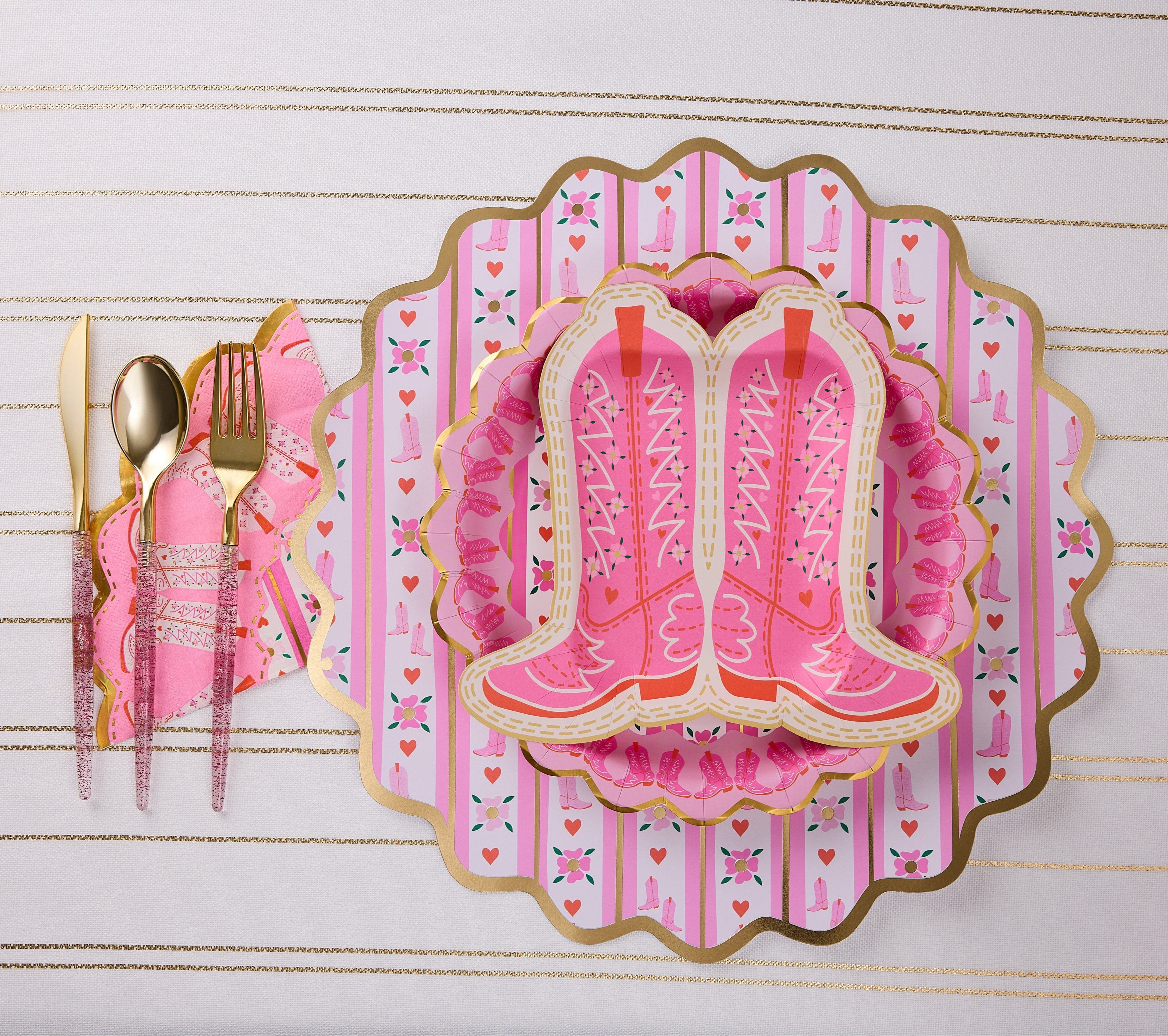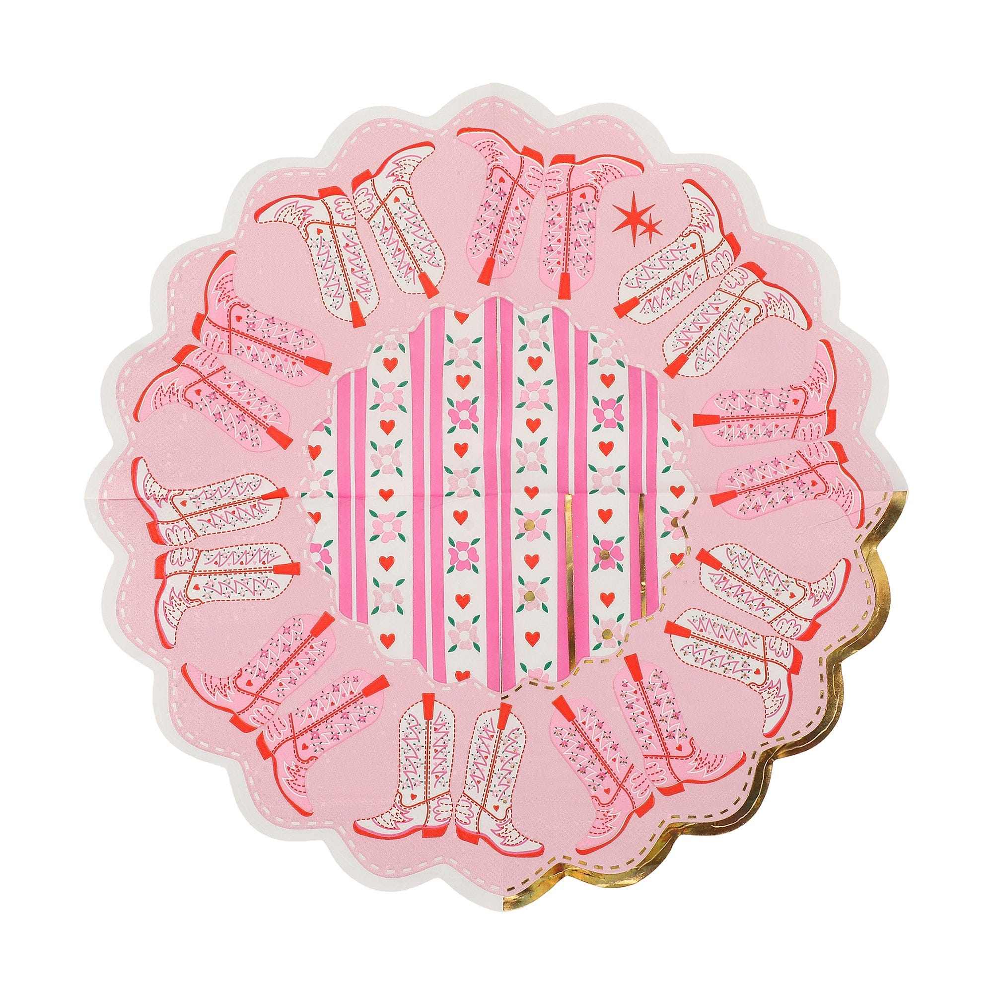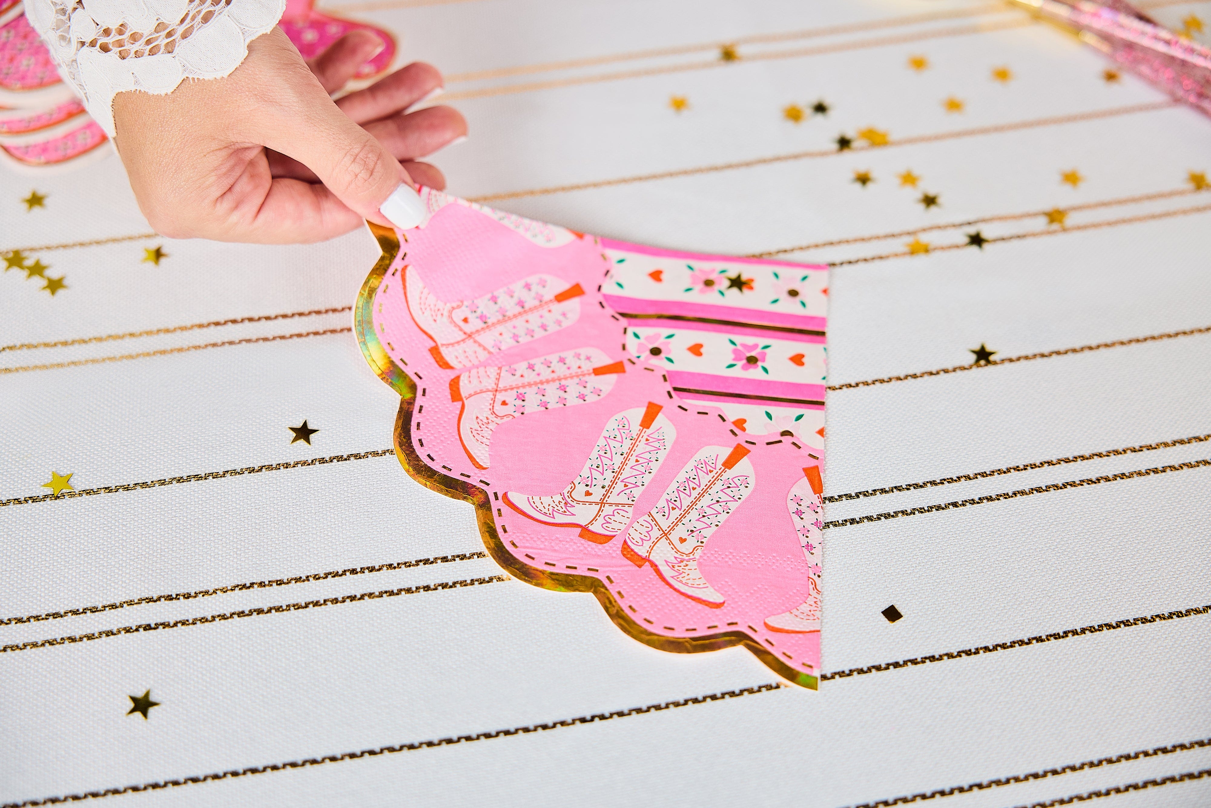 Add a little giddy-up to your get-together with the Packed Party Boot Scoot Blooms Diecut Dessert Napkin Set! These adorable 3-ply napkins feature a pink western-inspired pattern and shine bright with gold foil accents and scalloped edges that bring the sparkle to every bite. Perfect for dessert tables, birthdays, or any party where you're ready to boot-scoot and boogie, these napkins are just the right mix of playful and practical. Wrangle up the treats and let the party ride on, cowgirl!