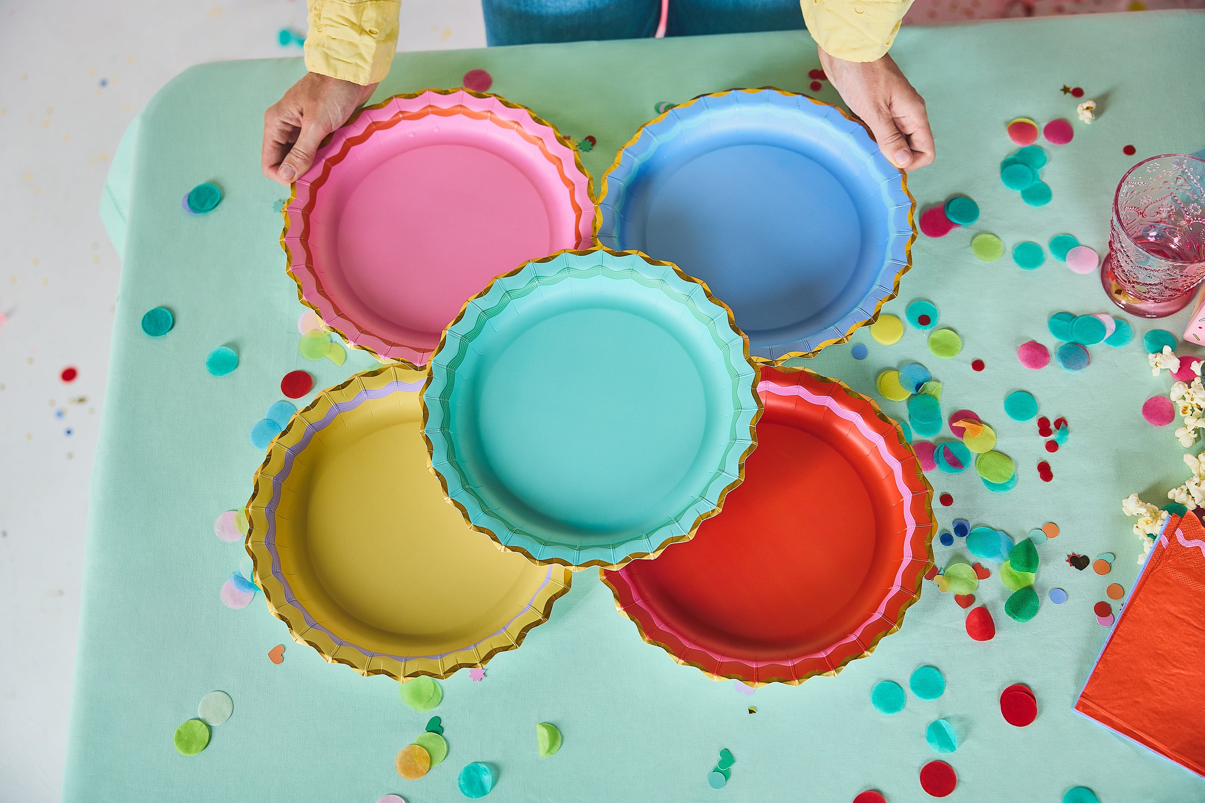 Bring the bold and brighten up your bash with the Packed Party Rainbow Ric Rac Assorted Dinner Plate Set! Bursting with playful personality, these paper dinner plates feature a mix of 5 playful color combinations with ric rac detailing, scalloped edges, and luxe gold foil accents that add just the right pop of shine. These paper plates are sturdy, durable, and designed to hold up to all your sweet (and savory) treats without bending or leaking. Perfect for birthday parties or making any meal a little more magical, this assorted set serves up serious style with every bite!
