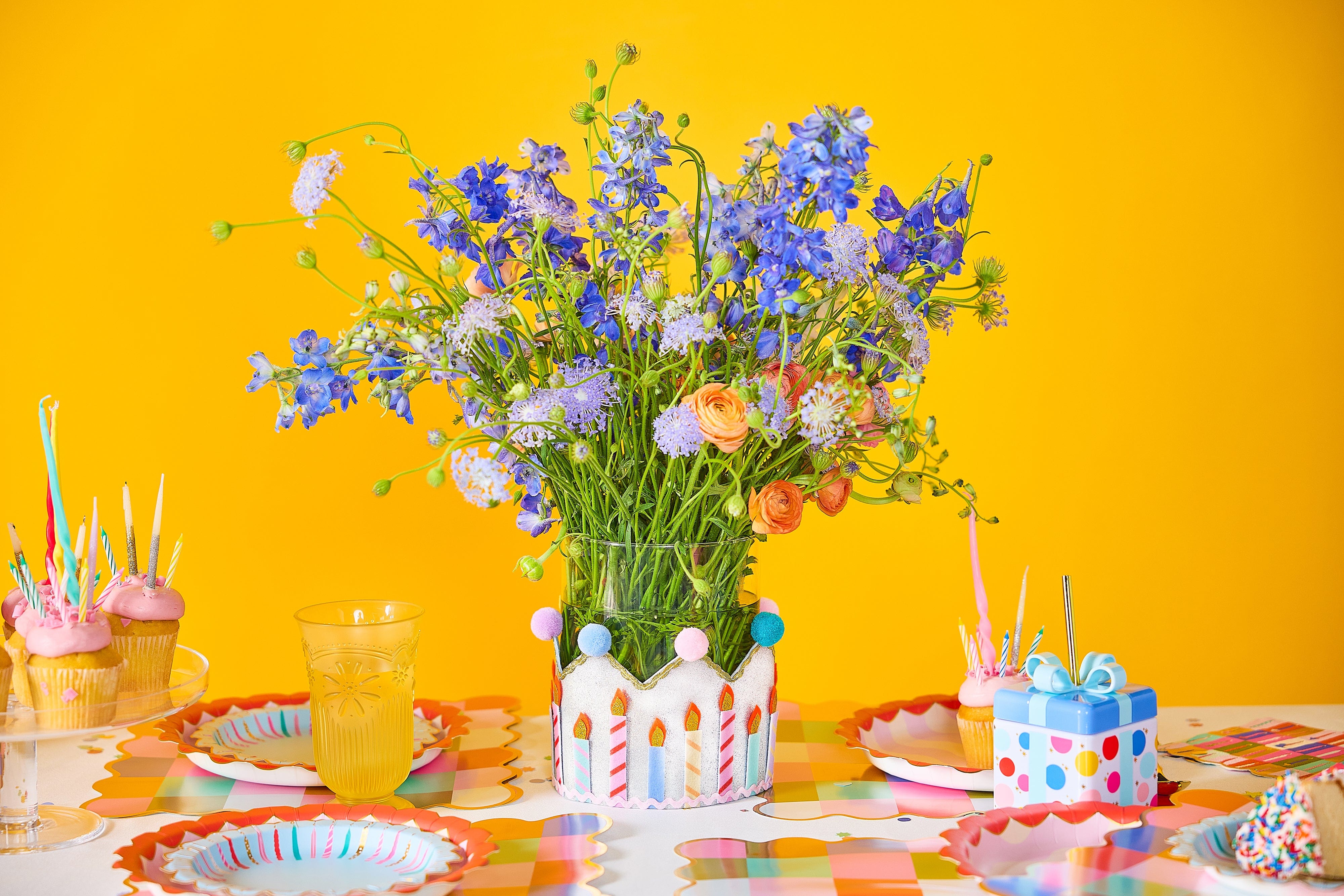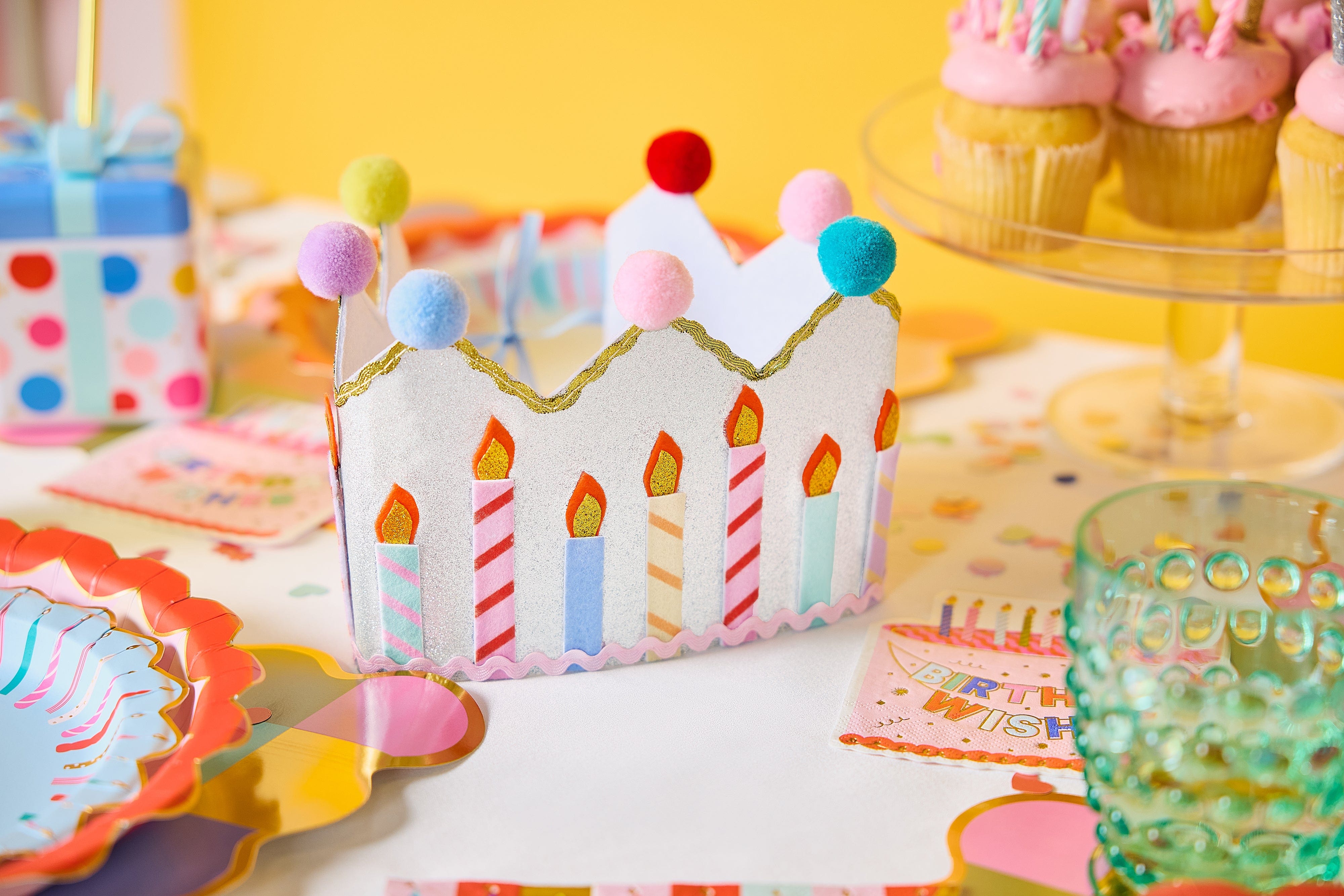 Top off your birthday with a little extra sparkle! This party-perfect crown is made for birthday girls (and guys!) of all ages who want to stand out while making their wish. Featuring shimmering metallic fabrics, colorful birthday candles, and topped with playful pom poms, it’s a total showstopper. Lightweight and comfy with an adjustable satin grosgrain tie, this festive accessory guarantees your celebration shines as bright as you do. Go on, wear the crown, it’s your day to shine!