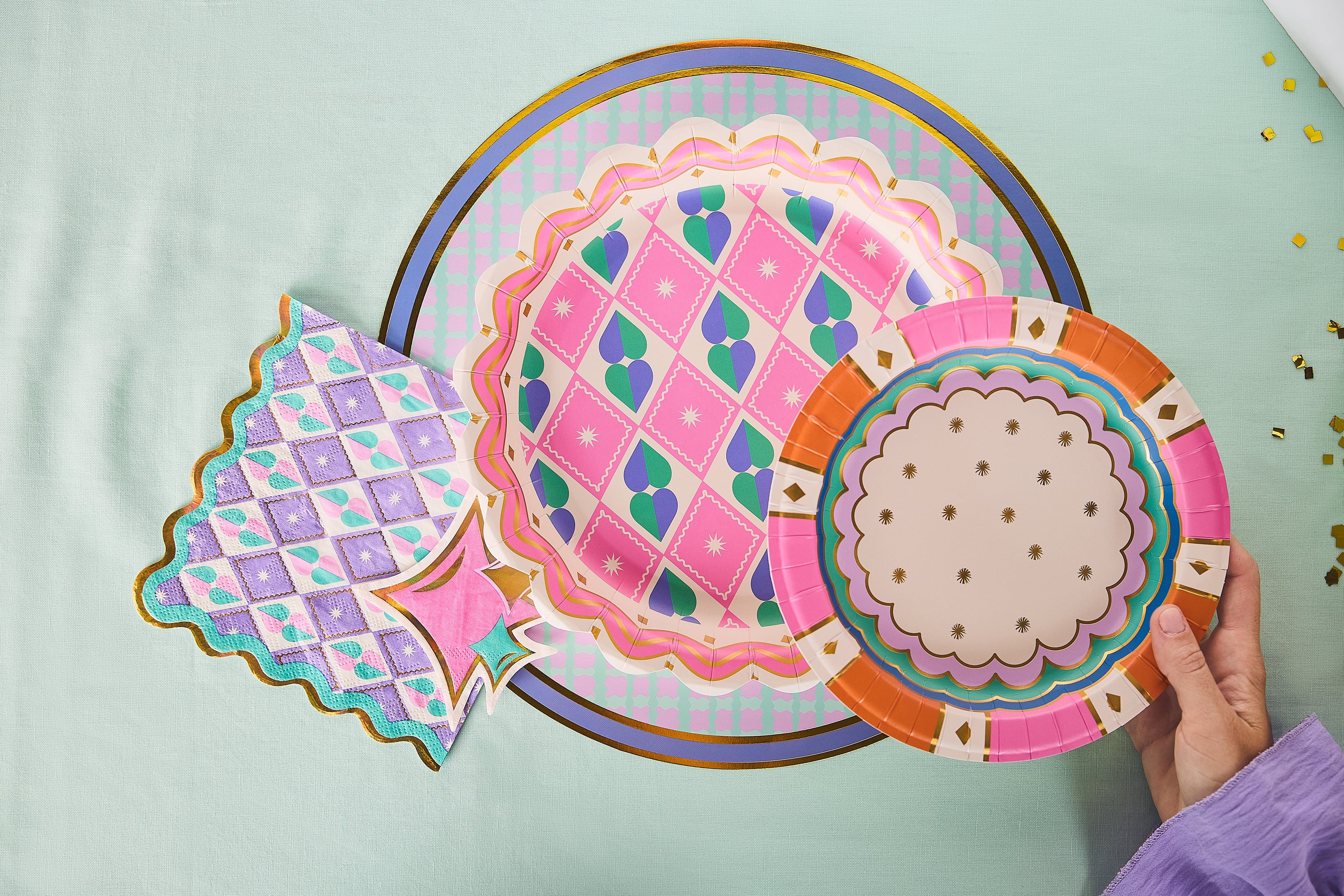 Step right up and add a touch of magic to your tablescape with the Circus Soirée Luncheon Napkins. Designed with a playful diamond pattern in pastel purple, pink, and teal, these 3-ply napkins feature shimmering gold foil accents and a scalloped edge for extra flair. Perfect for circus-themed birthdays, carnivals, or any colorful celebration, they’re as sturdy as they are stylish - keeping your party clean while bringing the fun center stage.