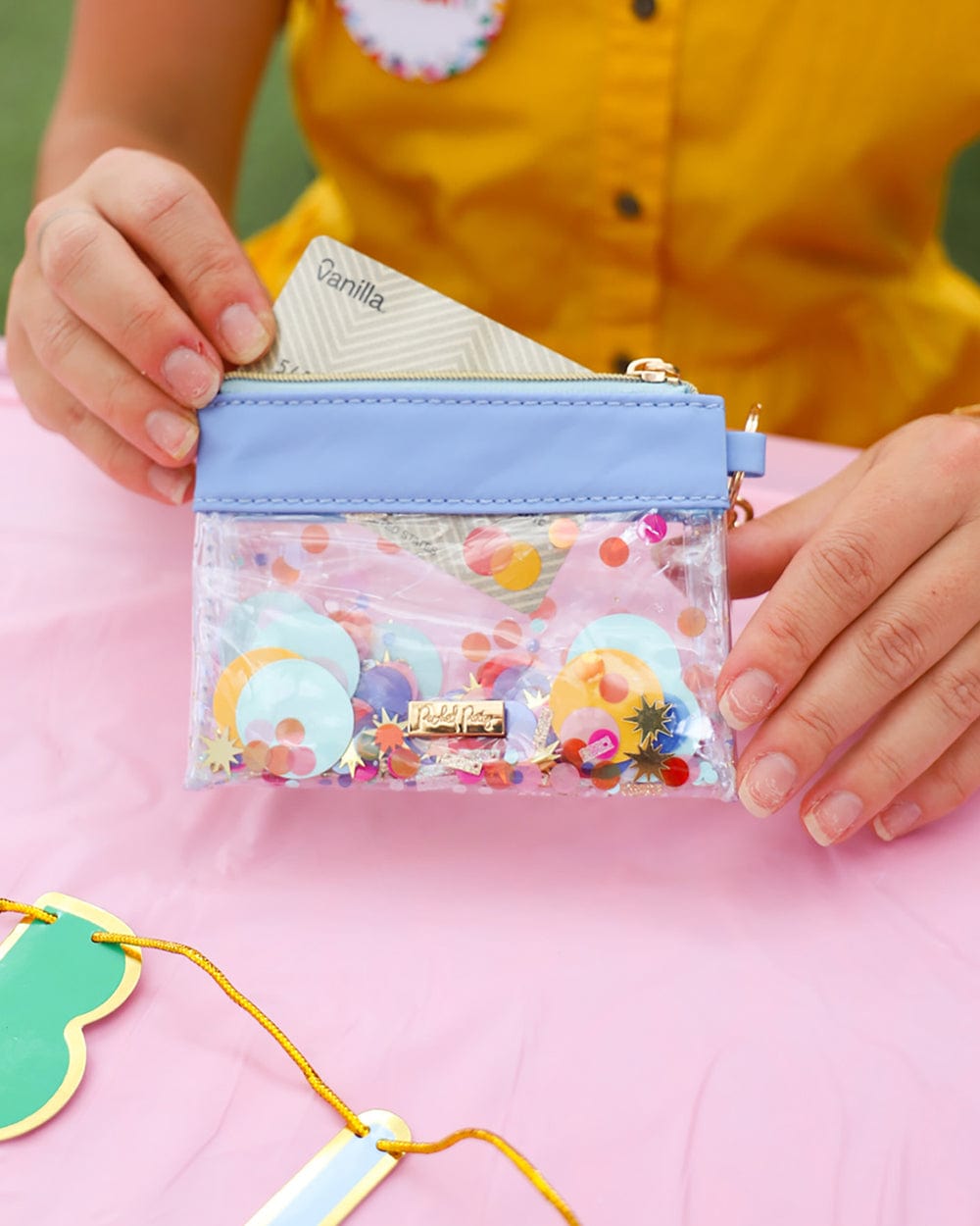 Make your everyday routine into a party thanks to this set of two built for fun! Packed with our 'Celebrate' confetti and with heavy duty vinyl too make this keychain wallet and matching pouch the ideal duo for on-the-go fun.