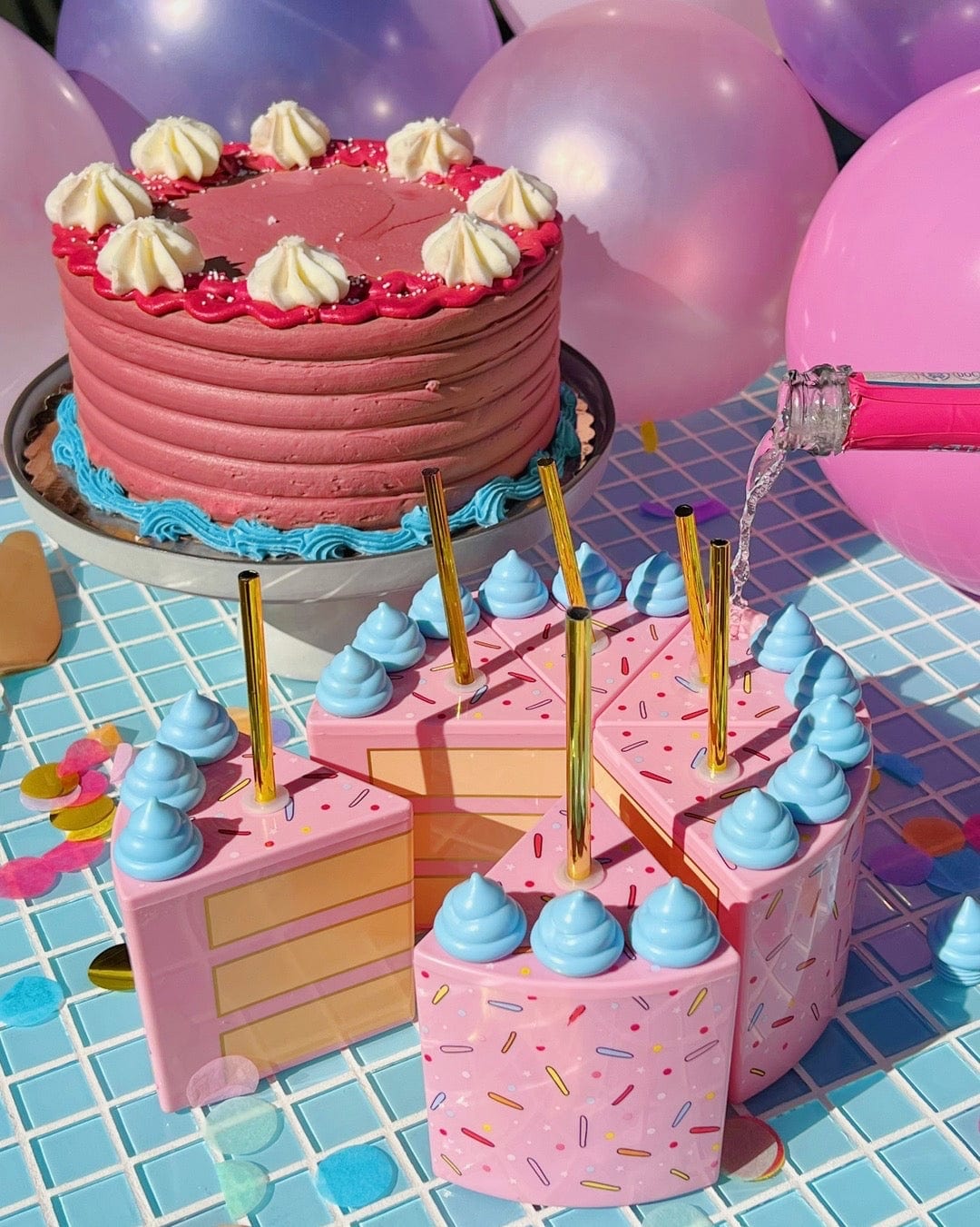 Celebrate in the sweetest way with the Packed Party Cake Sipper Set! This set of 6 reusable cake slice-shaped cups comes together to form a full birthday cake - complete with sprinkle details, pastel blue “frosting,” and shiny gold straws. Perfect for birthdays, bachelorette parties, girls’ nights, or any celebration that calls for cake and cocktails, these novelty drink cups are as fun as they are functional. Use them individually as party favors or display them together as a show-stopping centerpiece. Made from durable BPA-free plastic, these cake sippers can be reused to keep the party going slice after slice.