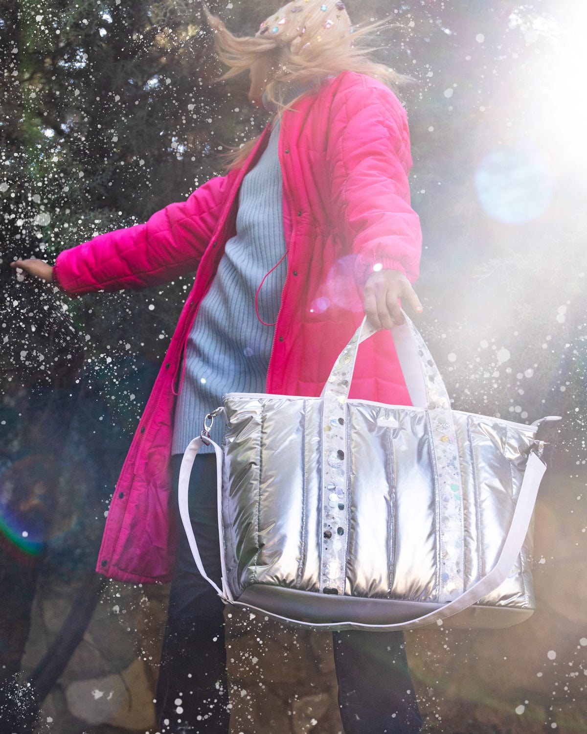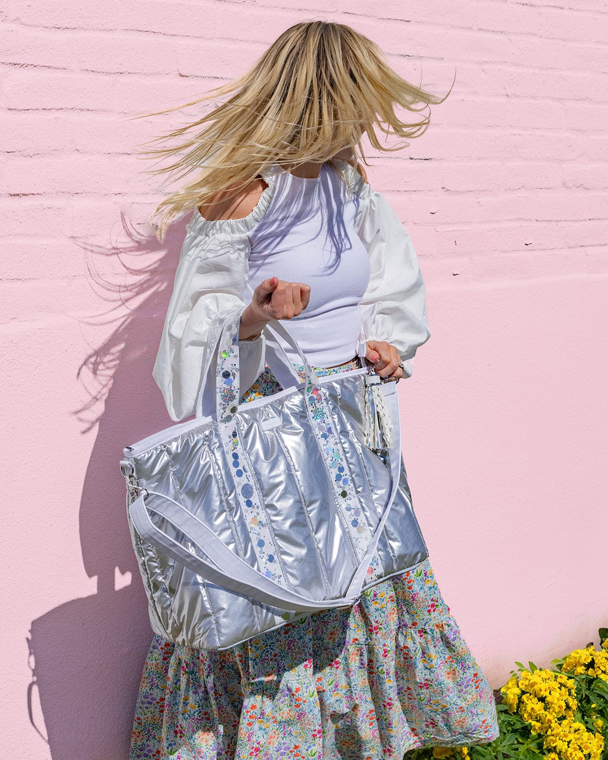 Travel in style with the Starlight Metallic Confetti Duffel, the ultimate statement bag for work, weekends, and everything in between. Made with a durable metallic silver quilted finish, this eye-catching duffel features signature Packed Party confetti-filled straps that sparkle and shine with every step. Spacious enough to hold all your travel essentials - think clothes, shoes, toiletries, and more - it’s the perfect carry-on bag, gym bag, or overnight duffel. Complete with top handles, a detachable crossbody strap for hands-free carrying, and a zip-top closure to keep everything secure, this confetti duffel makes packing as fun as the party you’re headed to.