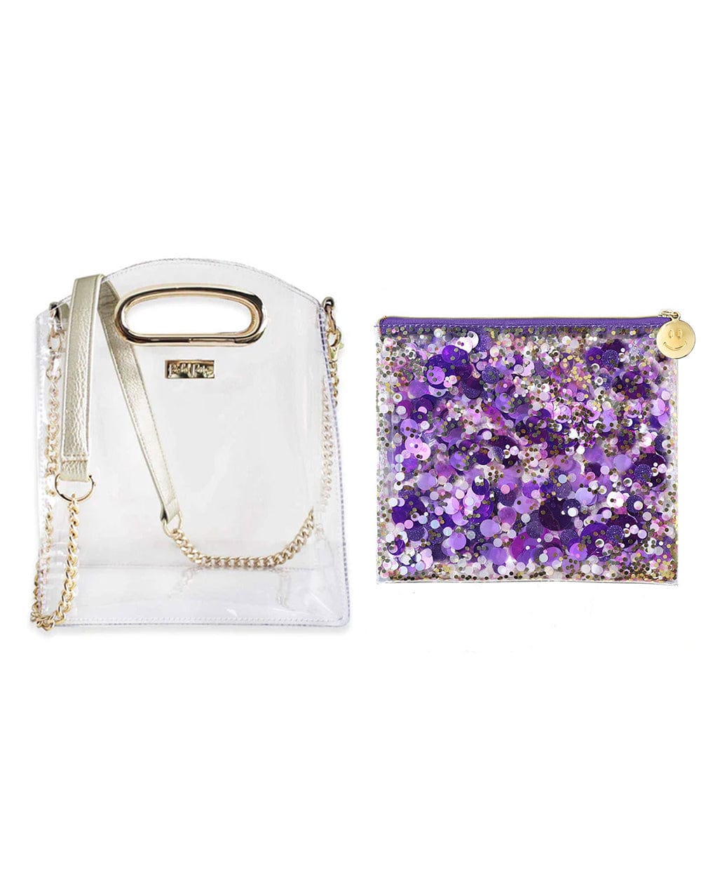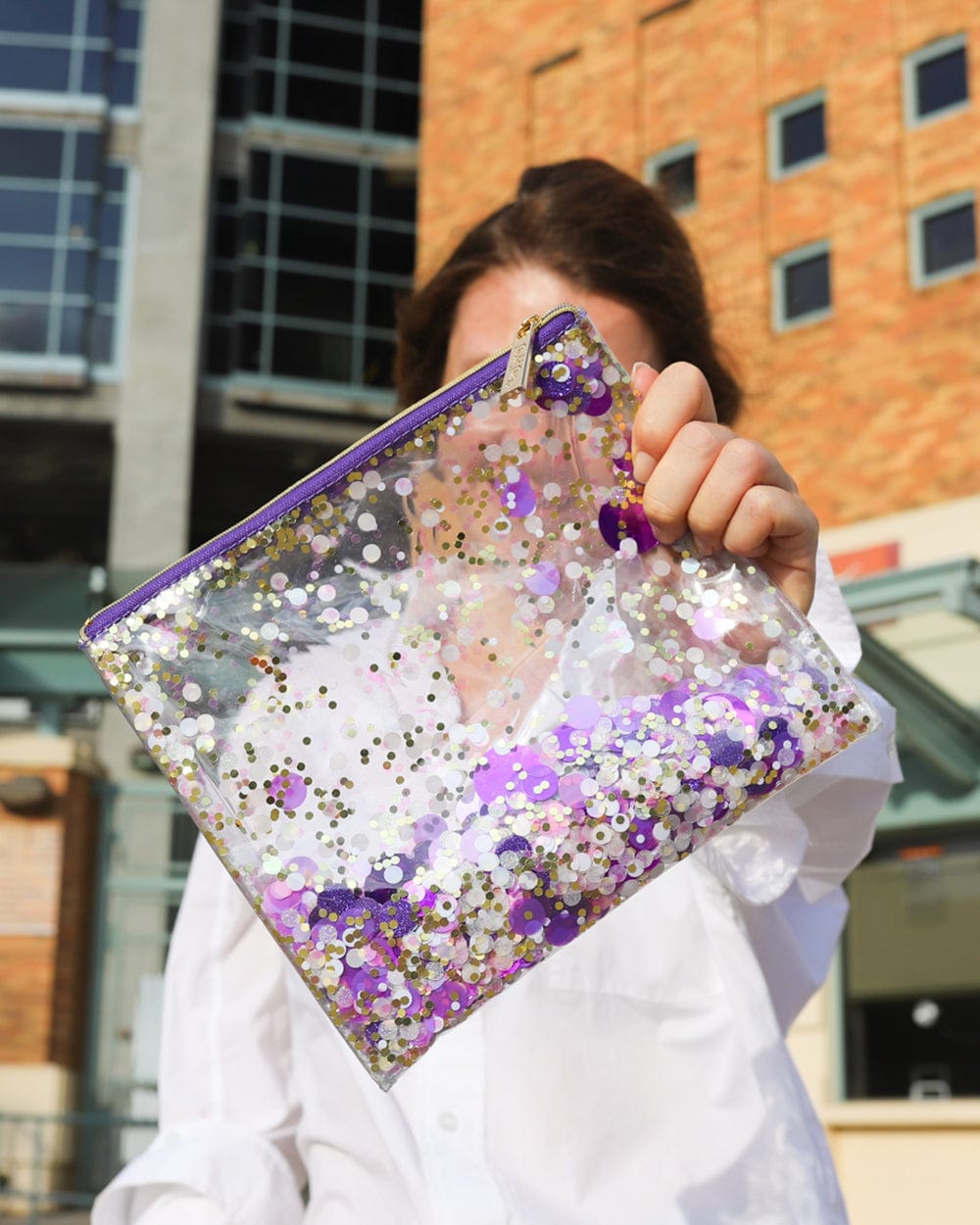 Get gameday ready thanks to this ready-to-use set of two! Clear and stadium approved, this bag and purple crush confetti pouch set is the perfect bundle to take to any game and cheer on your favorite team! Now what game are we headed to?
