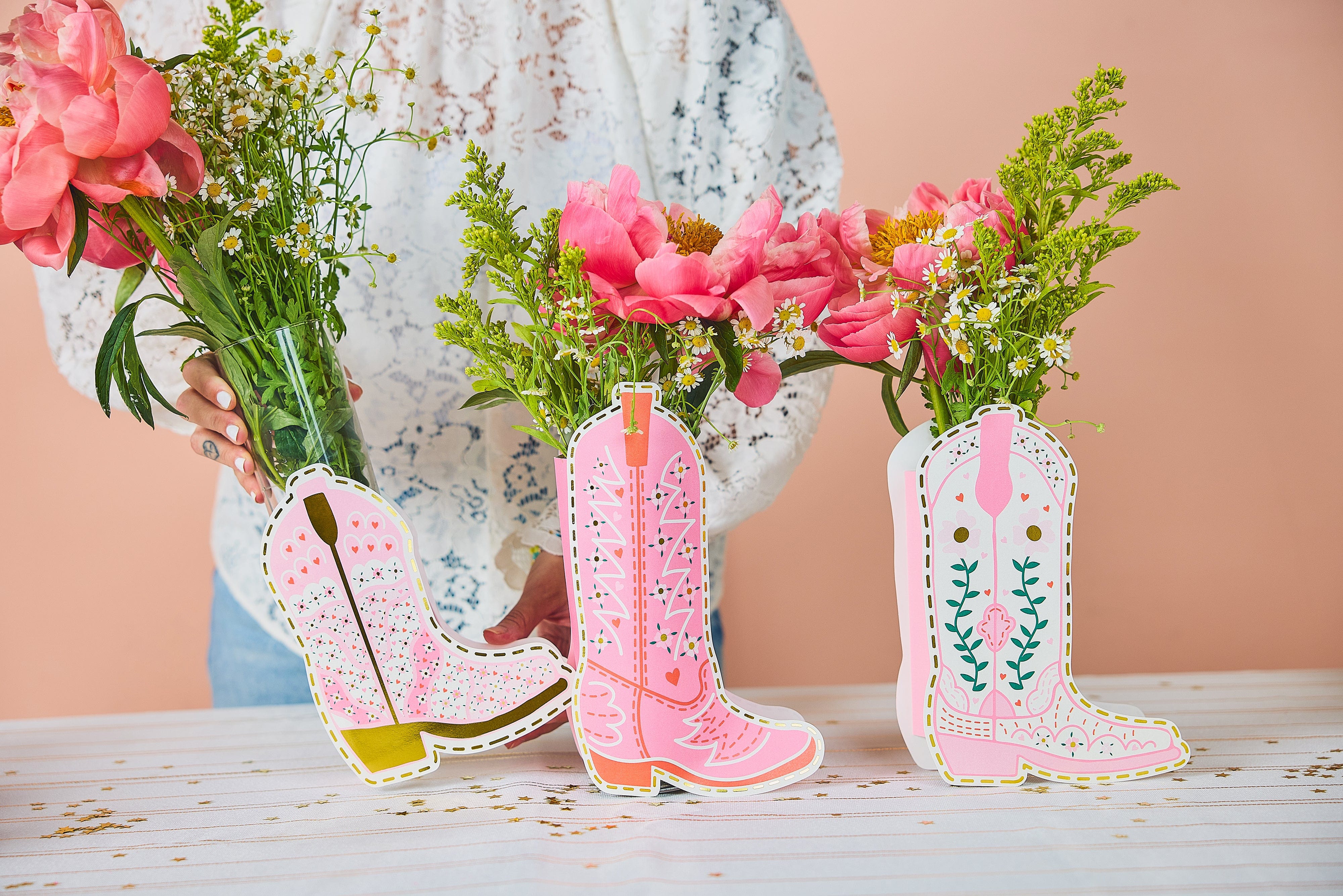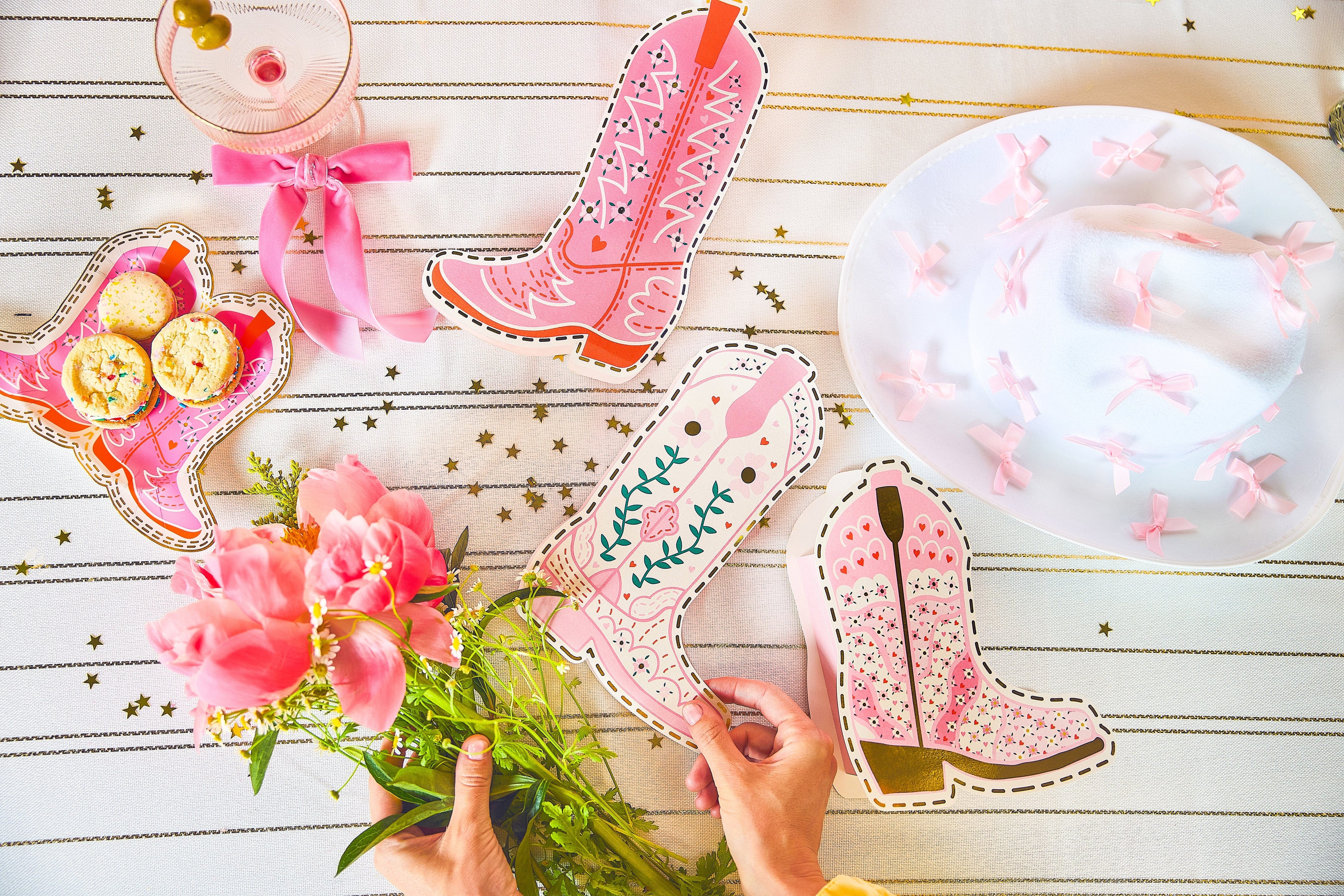 Kick up your tablescape with the Boot Scoot Blooms Pop-Up Vase Slip Covers! This set comes with pink cowboy boot-shaped vase sleeves in three different sizes to fit your favorite blooms in the cutest way possible. Just slip 'em on top of your vase, pop in your flowers, and let the compliments roll in!