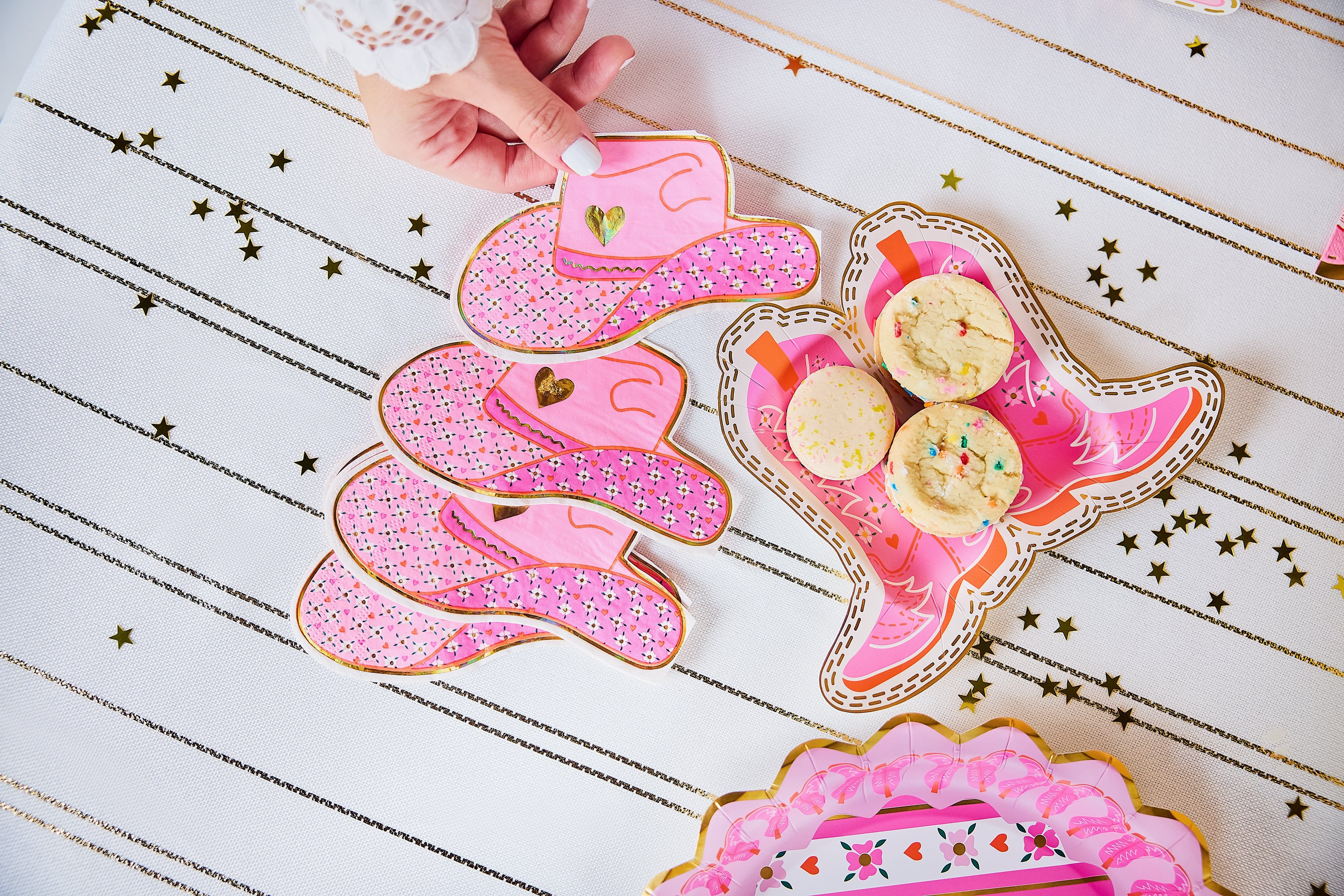 - Hey Cowgirl Diecut Cocktail Napkins (20 count) – Pink cowgirl hat napkins with gold foil accents