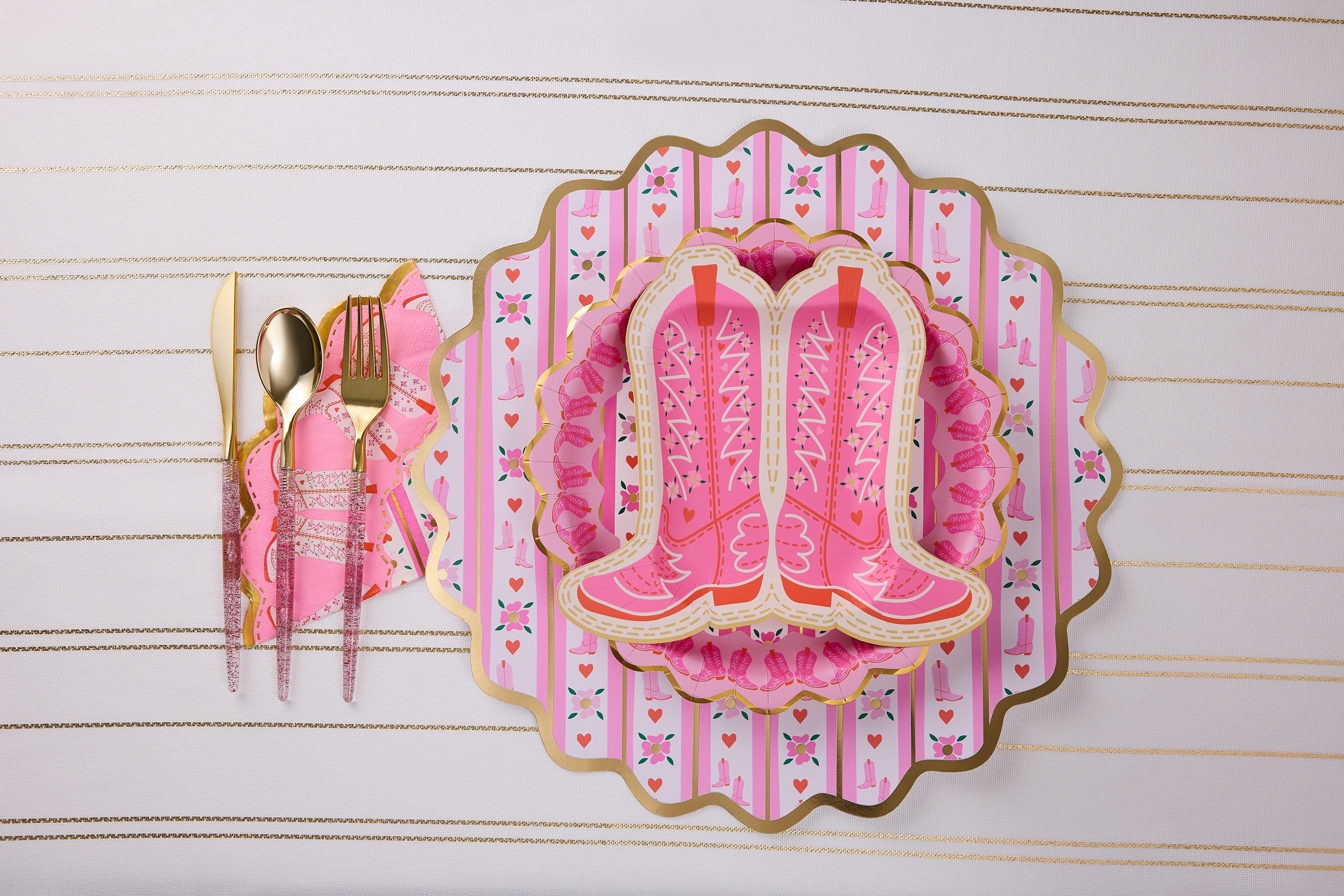 - Boot Scoot Blooms Cowboy Boot Dessert Plates (10 count) – Fun die-cut boot plates perfect for cake, cupcakes, or sweet treats