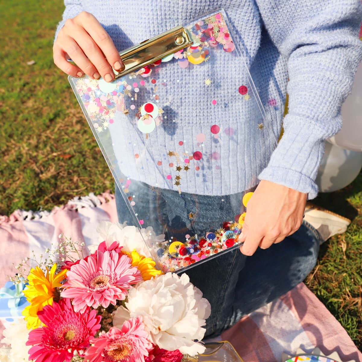 - Double wall acrylic clipboard filled with trapped celebratory confetti