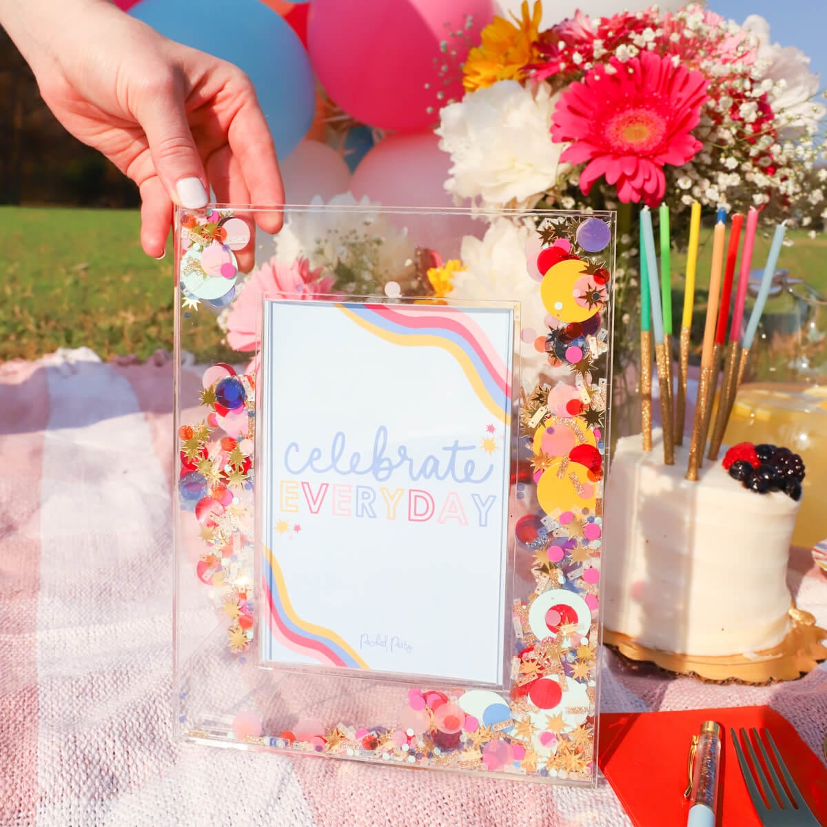 - Acrylic picture frame with shakeable celebratory confetti