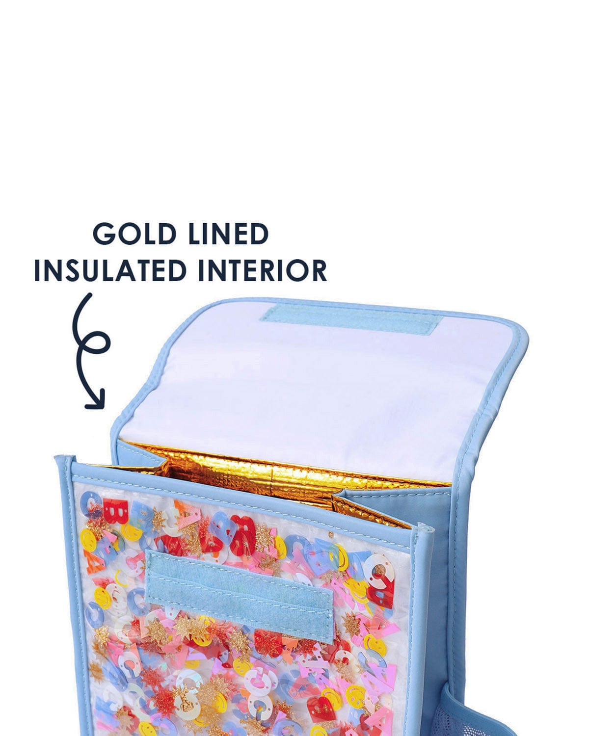 • Blue nylon exterior with clear vinyl with trapped Little Letters confetti