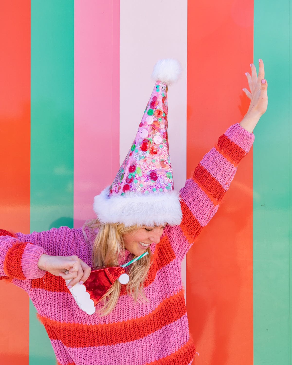 Celebrate the holidays in an extra bright way with this super fun Santa hat! Featuring trapped multicolored confetti plus a white faux fur trim and pom pom, this festive Santa hat is sure to bring the party to your holiday gatherings!