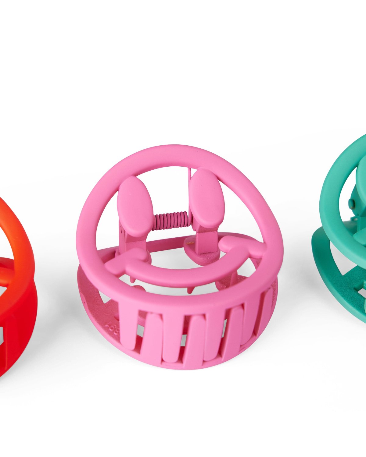 Bring a smile with you wherever you go thanks to this set of three matte finish smiley face claw clips. The perfect accessory for thin or thick hair, these ready-to-hold hair clips bring the holiday fun to any look!