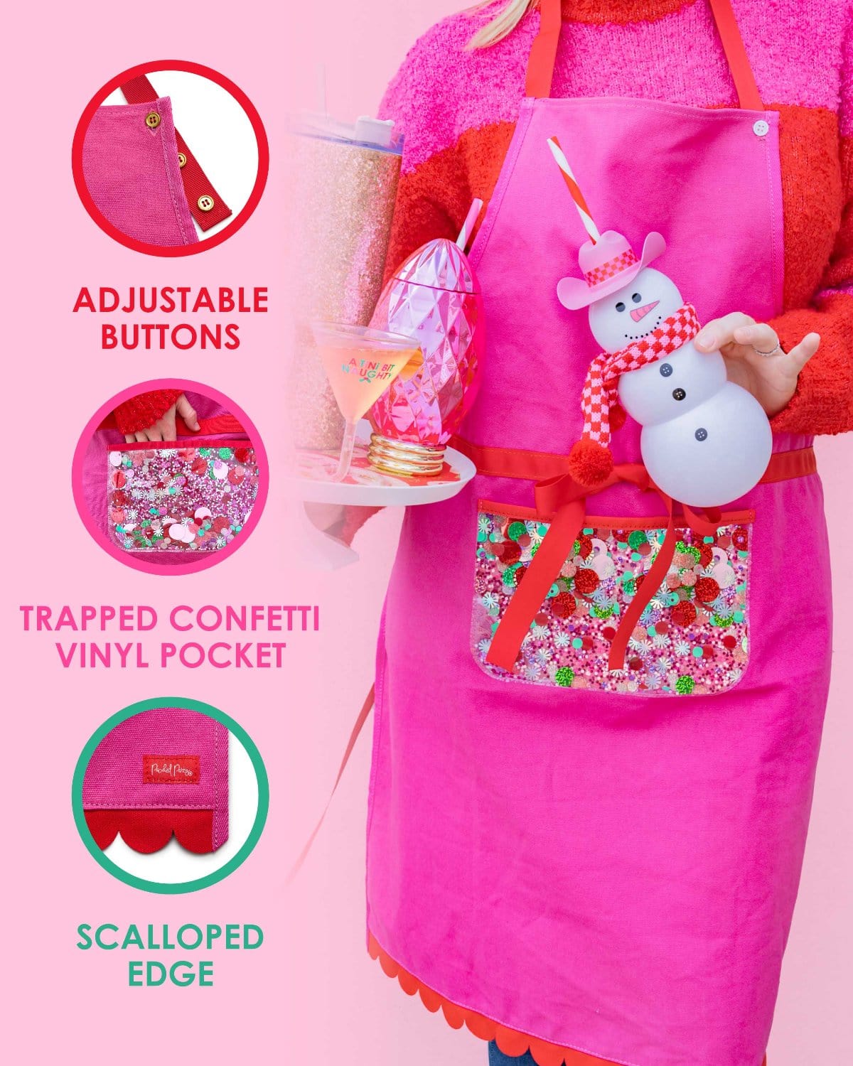 Whether you're playing hostess, baking cookies for the family, or just cooking dinner for one, this fun pink confetti apron is sure to spread some cheer! Featuring adjustable buttons for a customizable fit and a front confetti pocket to hold any kitchen tools or supplies, this one size fits most apron is the perfect way to protect your outfit from spills while looking cute as you cook! It makes the perfect hostess gift for any season or a gift to treat yourself!