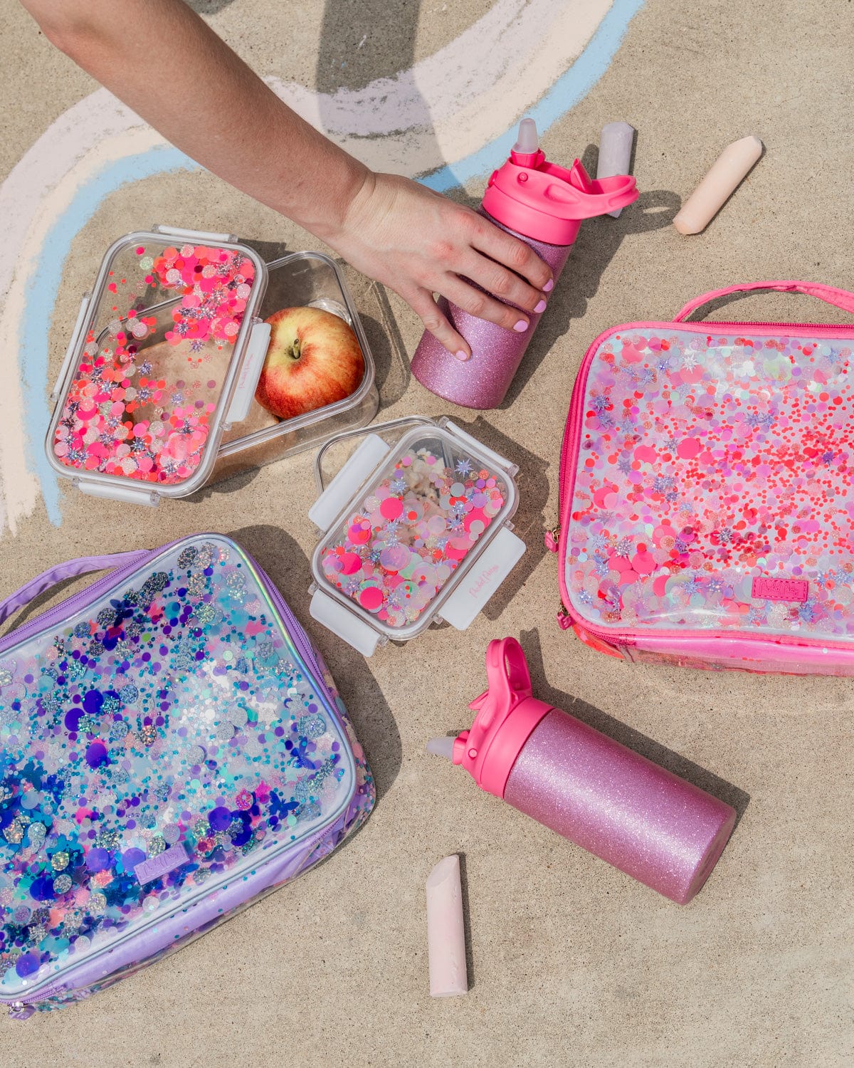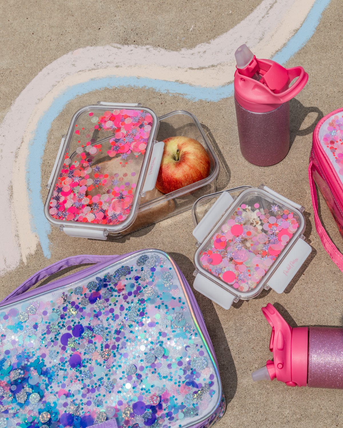 Make storing snacks and food a breeze with these BPA-free confetti-filled food storage containers we designed. With air-tight seals and ample room, this set of two is a must-have for anyone looking to pack their lunch (and a punch!) for school, work, and beyond. Did we mention these fit inside our matching Sweet Tart confetti lunch bag too? Talk about a party!