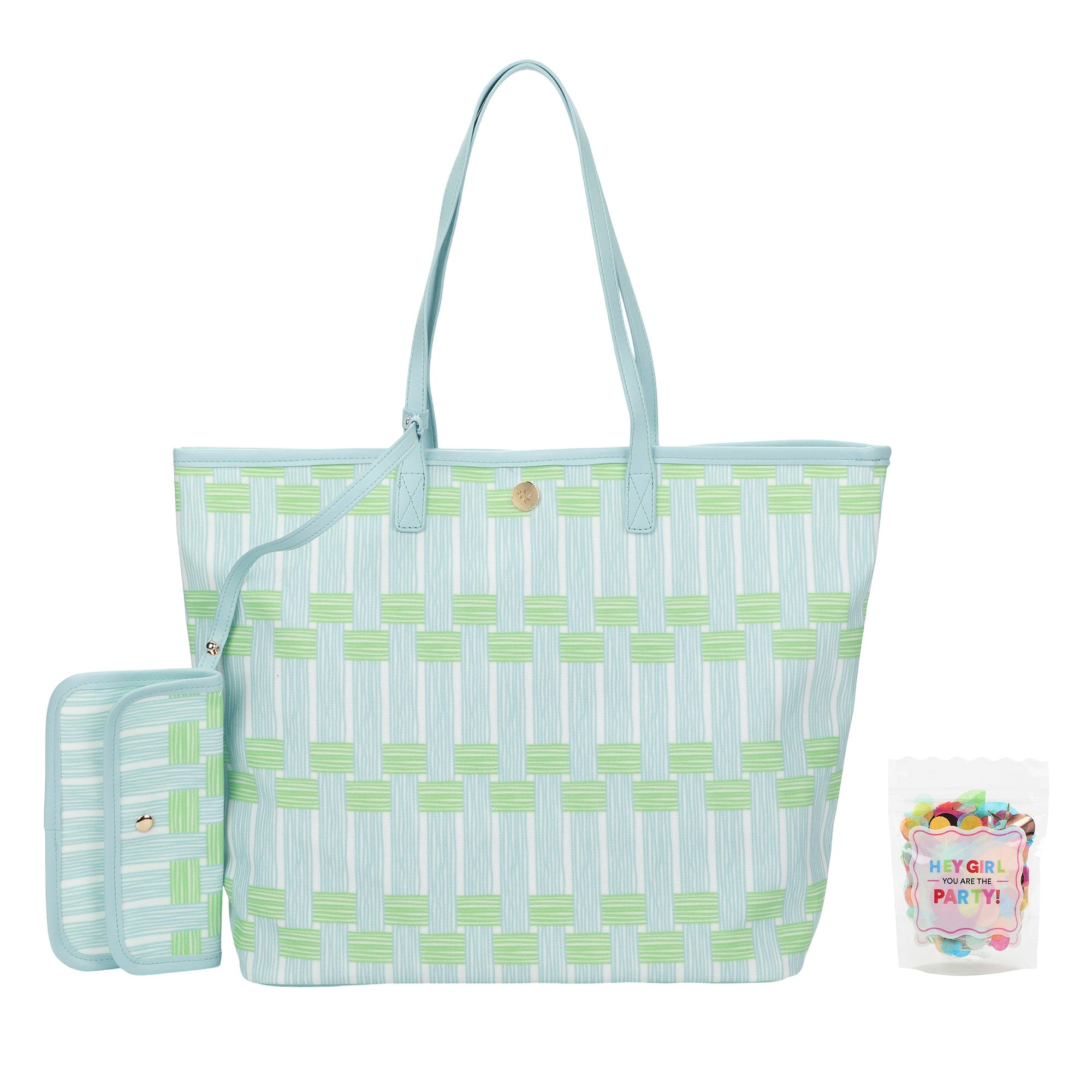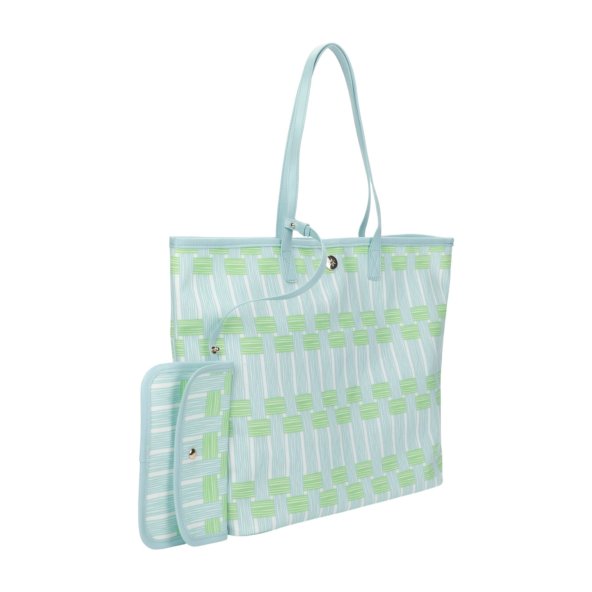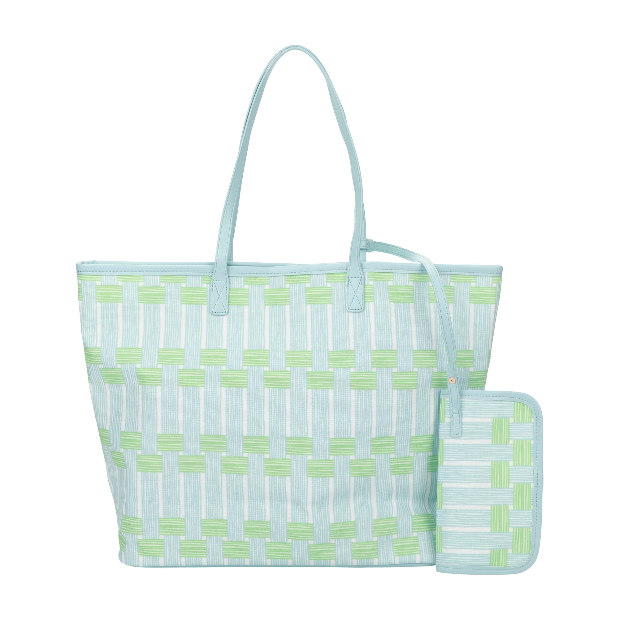 Meet your new go-everywhere essential: the Blue Latics Tote with Wristlet. Designed in durable printed coated canvas, this roomy tote features a chic allover pattern, leatherette straps and binding, and a detachable matching wallet pouch for easy organization on the go.