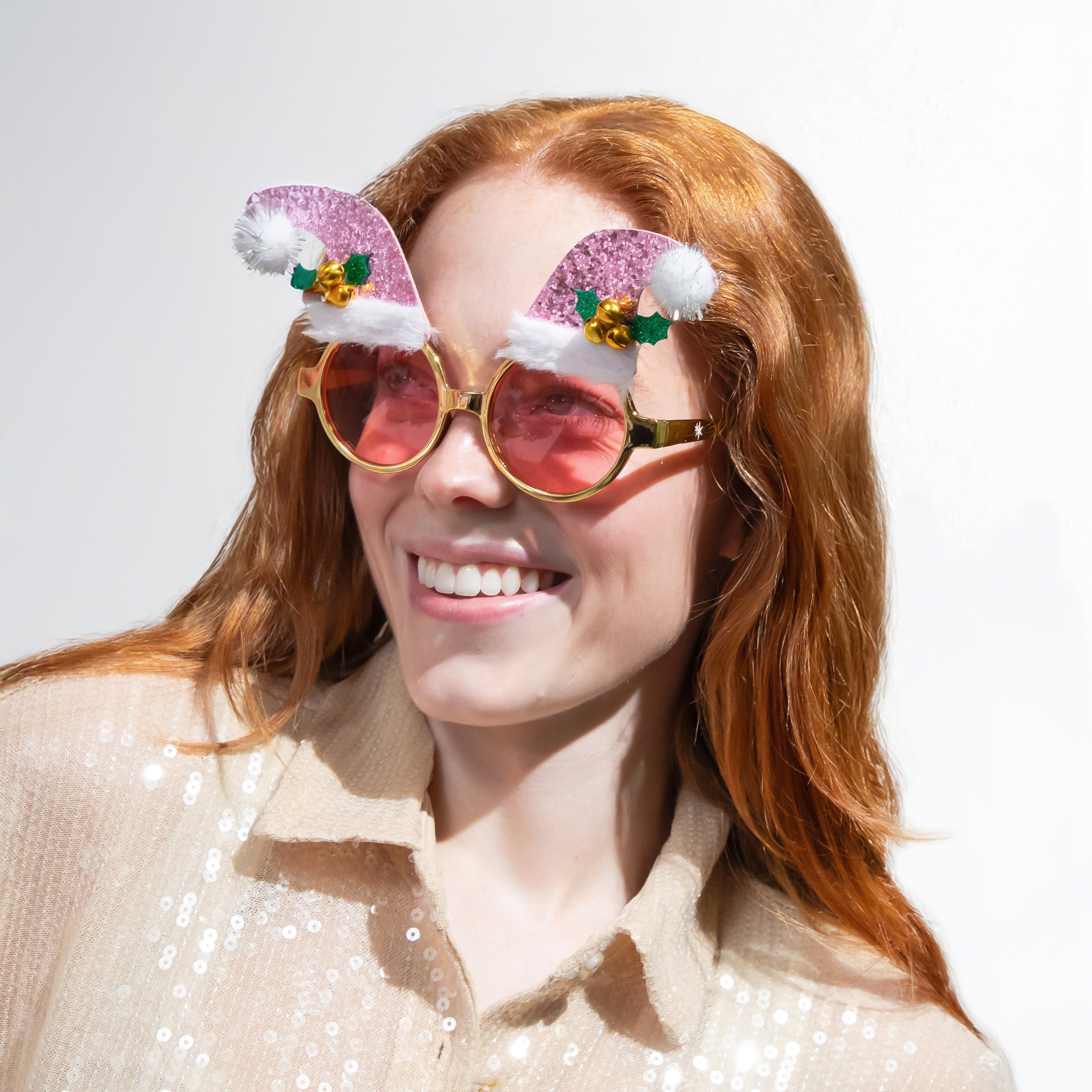 See the holidays through rose-colored glasses - literally! Our Santa Hat Novelty Glasses are the perfect way to add the sparkle and joy to your holiday looks this Christmas season! Featuring jolly pink glitter Santa hats, holly and gold bells, and plush pom poms for that over-the-top festive flair your outfit’s been waiting for this holiday season! Perfect for Christmas parties, stocking stuffers, White Elephant and Secret Santa gift exchanges or just decking yourself out in holiday cheer!