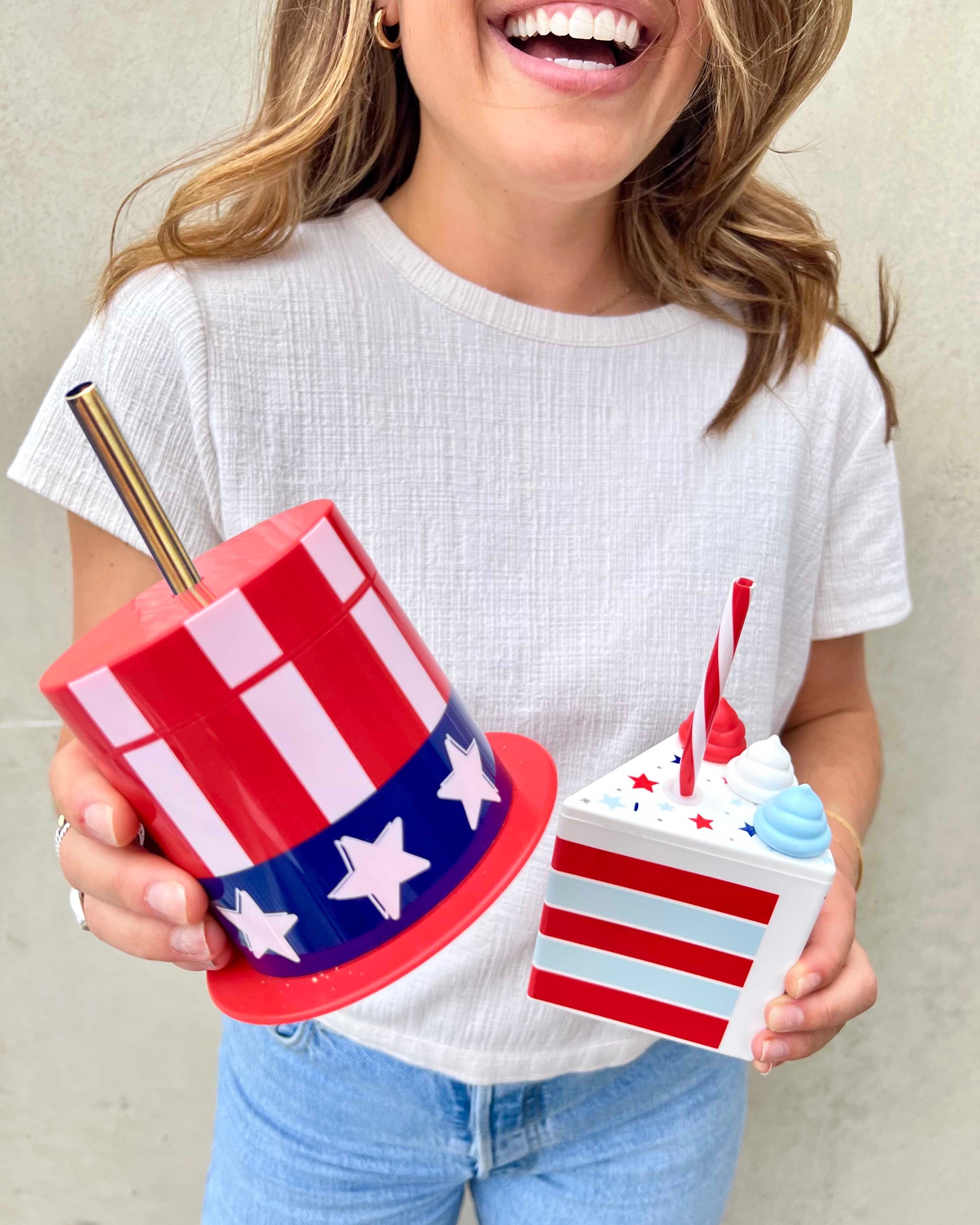 Raise a toast to the USA with our Hats Off Patriotic Sipper Set! This set of 2 novelty sippers is shaped like classic Uncle Sam top hats, complete with red and white stripes, bold blue bands, and white stars. Each sipper includes a reusable straw, making it the perfect party accessory for 4th of July celebrations, Memorial Day picnics, Labor Day BBQs, or any red, white, and blue gathering.