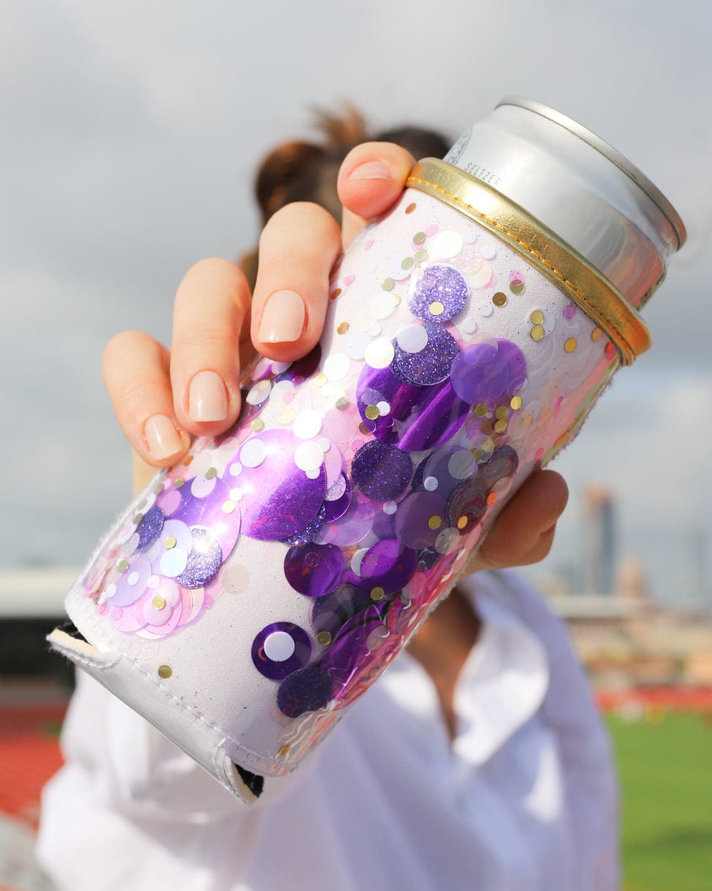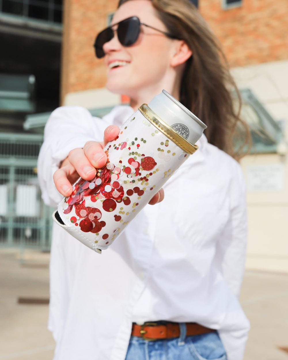 Say cheers in a big way come gameday thanks to this skinny insulated can cooler packed with confetti! This must-have accessory will ensure you're decked out in spirit no matter the school or occasion. We'll drink to that!