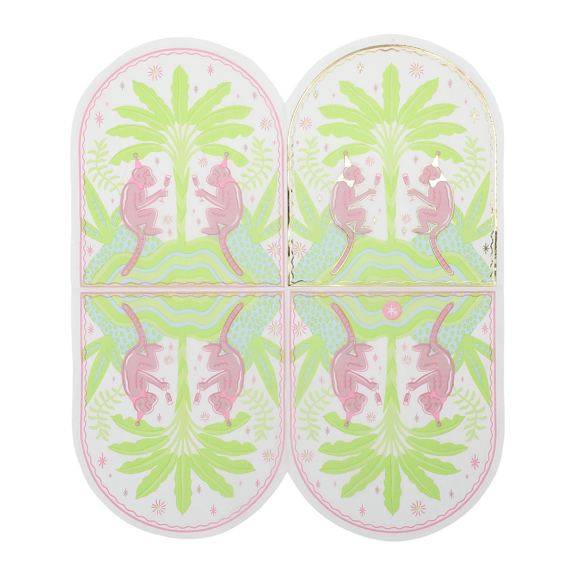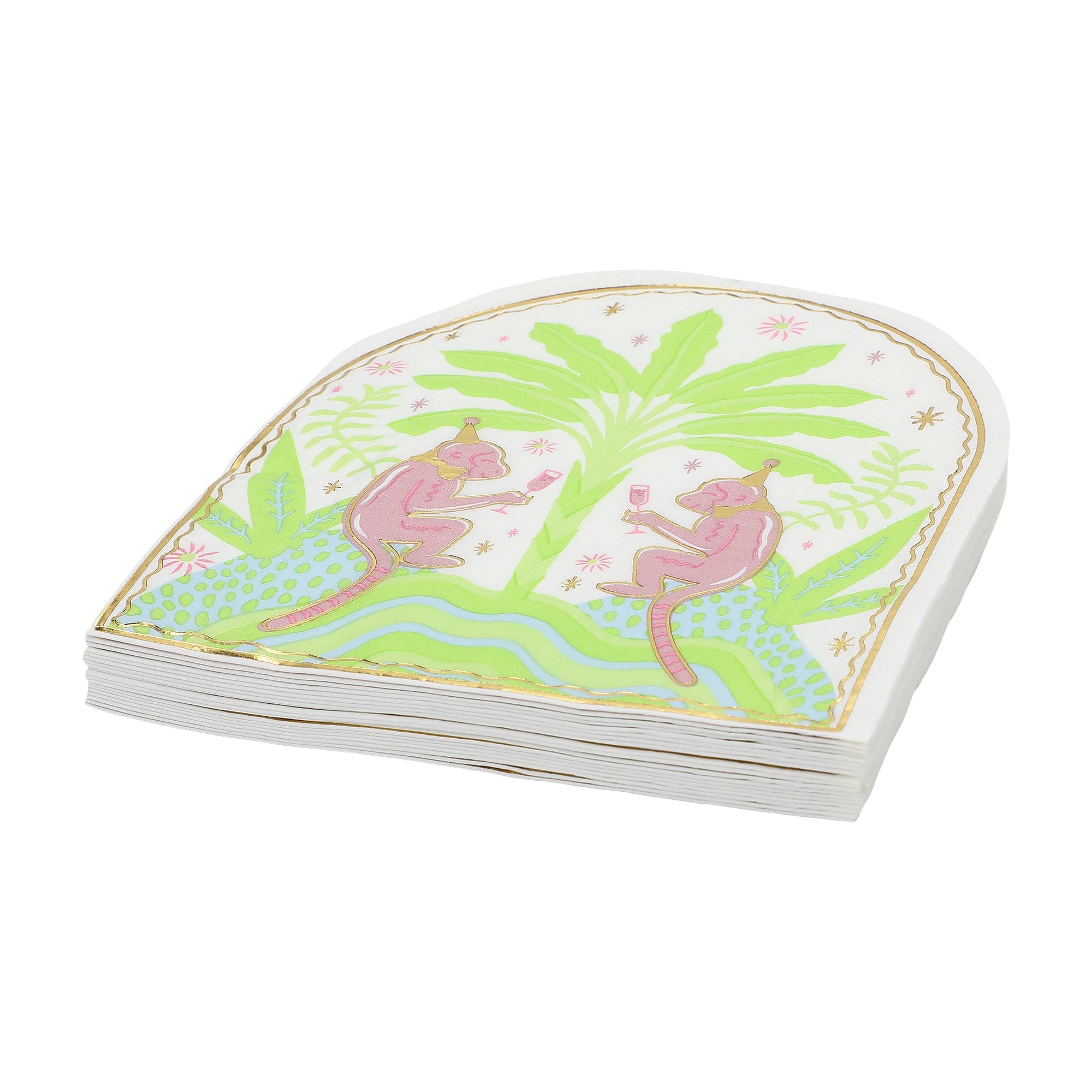 Set the scene for a celebration worth clinking glasses over with the Party Animals Die-Cut Napkin Set. Featuring a whimsical mirrored illustration of festive party animals raising a toast beneath a lush palm tree, these uniquely shaped napkins bring playful charm and elevated style to any gathering.