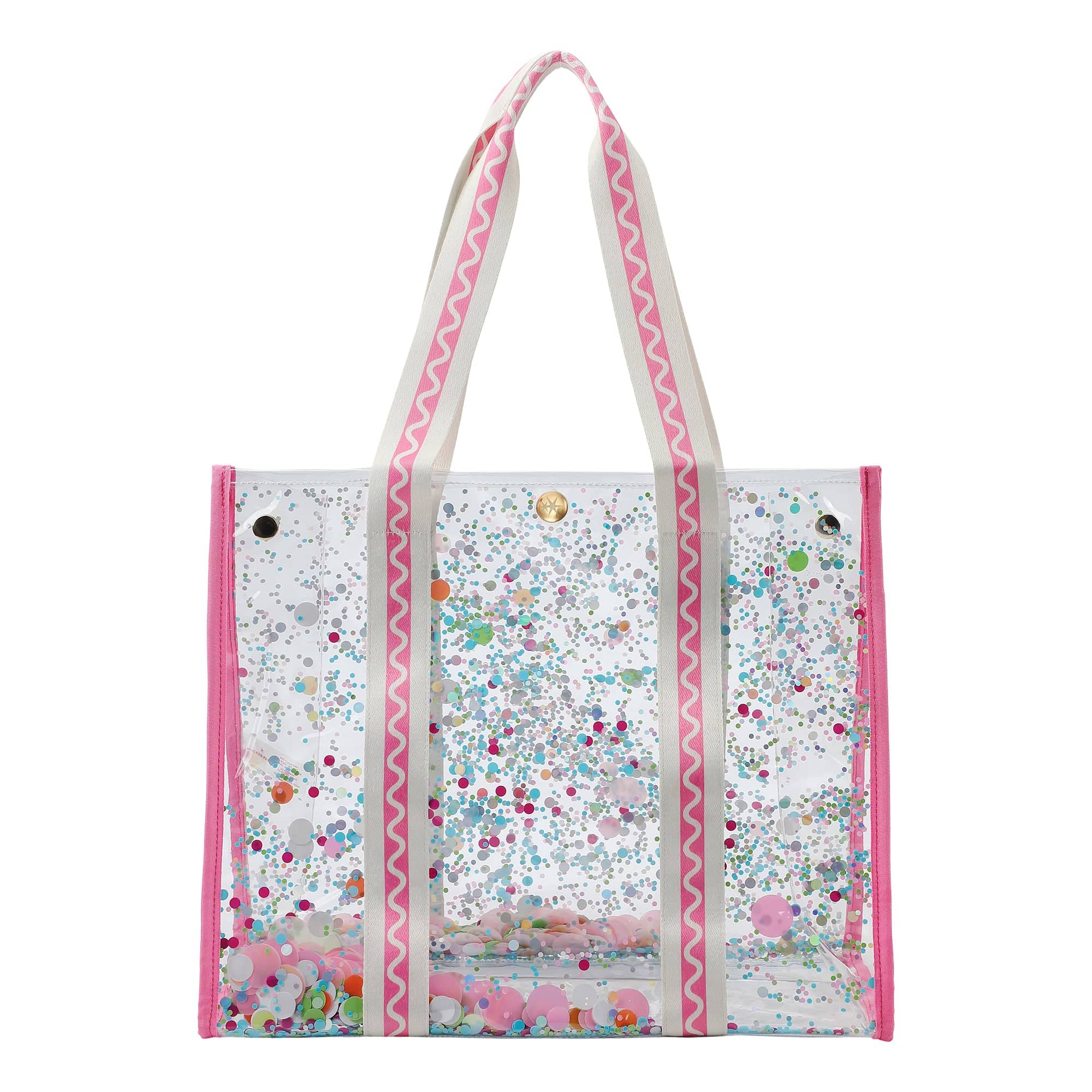 Bring the party everywhere you go! The Confetti Carry-All Clear Vinyl Tote Bag is made to sparkle from every angle. Featuring trapped multicolor confetti inside clear vinyl, this tote is equal parts practical and playful - perfect for beach days, poolside hangs, concerts, or everyday errands that could use a little extra fun.