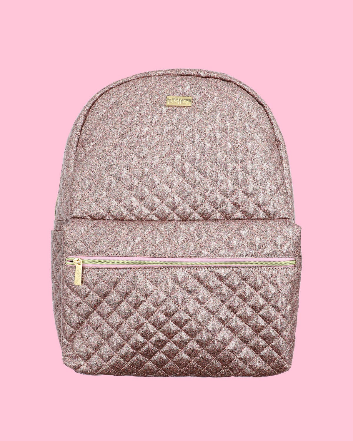 Add some sparkle to your school or workday with this oversized pink metallic quilted backpack! Featuring glitter coating and an adorable bow-shaped handle, this cute backpack is the perfect accessory for any party girl on the go.