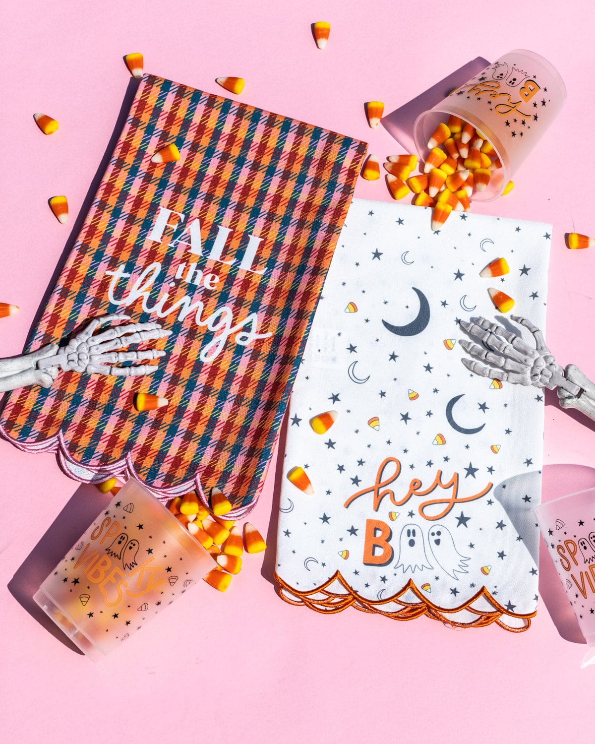 Bring some spooky-cute style to your kitchen with our Hey Boo Halloween Tea Towel. Designed with playful ghosts, candy corn, moons, and stars, this festive towel is finished with scalloped orange trim and the cheeky phrase “Hey Boo.” Perfect for adding Halloween spirit to your home, it’s both decorative and functional.